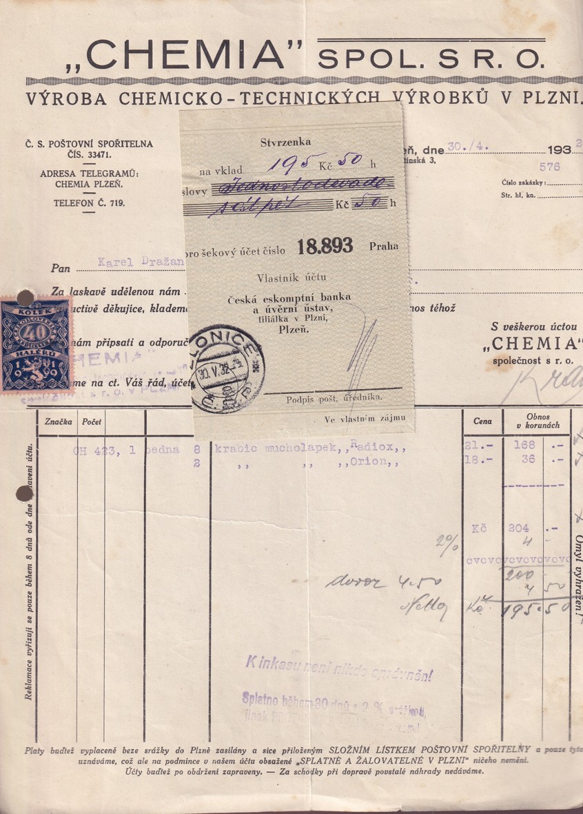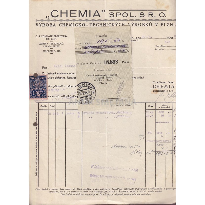 Faktura fy Chemia spol. s r. o. v Plzni