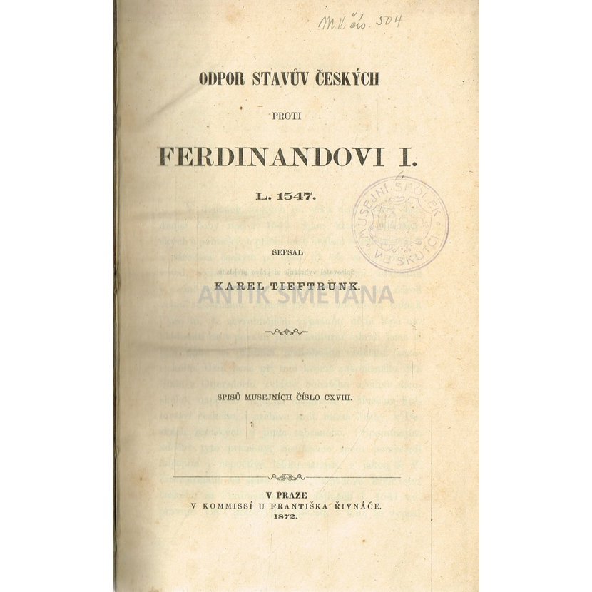 V kommissí u Františka Řivnáče v Praze 1872, 393 stran, vázané, vazba trochu odřená a zašpiněná